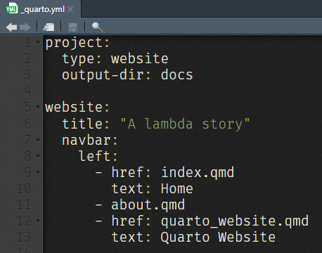 _quarto.yaml, qui permet le paramétrage global du site Web.gitignoreidentifie les fichiers et répertoire à ignorer par gitindex.qmdest le fichier associé à la page défaut du site Webabout.qmdest une page démo associée à la page principale<nom du projet>.Rprojest le fichier projet R associé au site Webstyles.cssest le nom de la feuille de styles par défaut