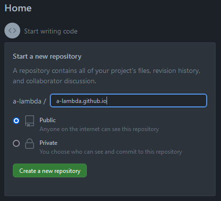 username.github.io. Il faudra bien sûr remplacerusernamepar votre nom d’utilisateur Github et sélectionner l’option Public pour que le site soit visible par tous (cf. Figure 3)Pour héberger un projet, le dépôt, si vous décider de l’appeler