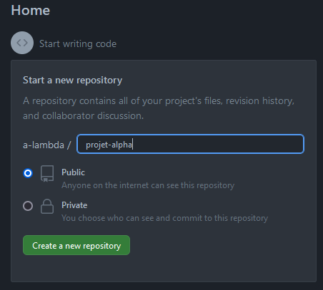- Depuis la page principale, créer un dépôt Github.
