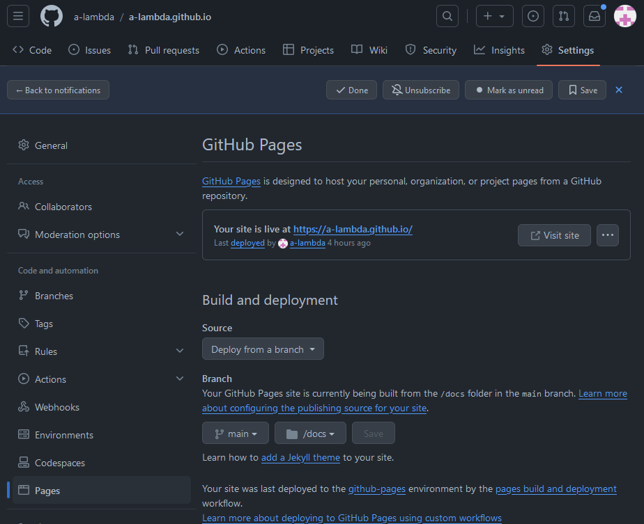 La ligne “Your site live at https://a-lambda.github.io” permet de vérifier que le rendu du site s’est correctement effectué. Un clic sur le bouton Visit site permet d’apprécier le résultat.